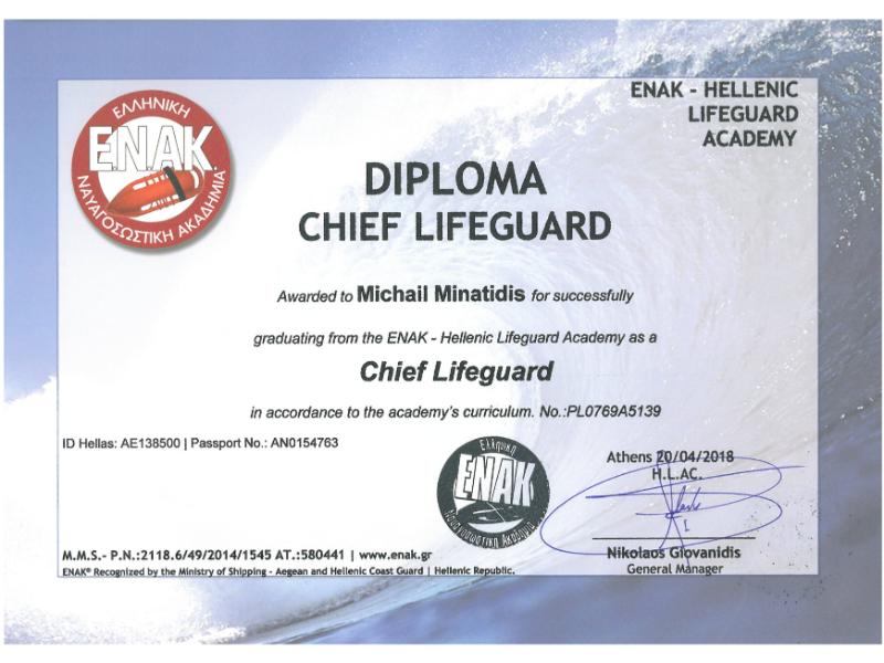 • In the year 2018 I In the year 2018 I graduated from ENAK lifeguard academy with the knowledge and the ability to provide CPR if necessary as well as to operate a defibrillator to restart the heart.