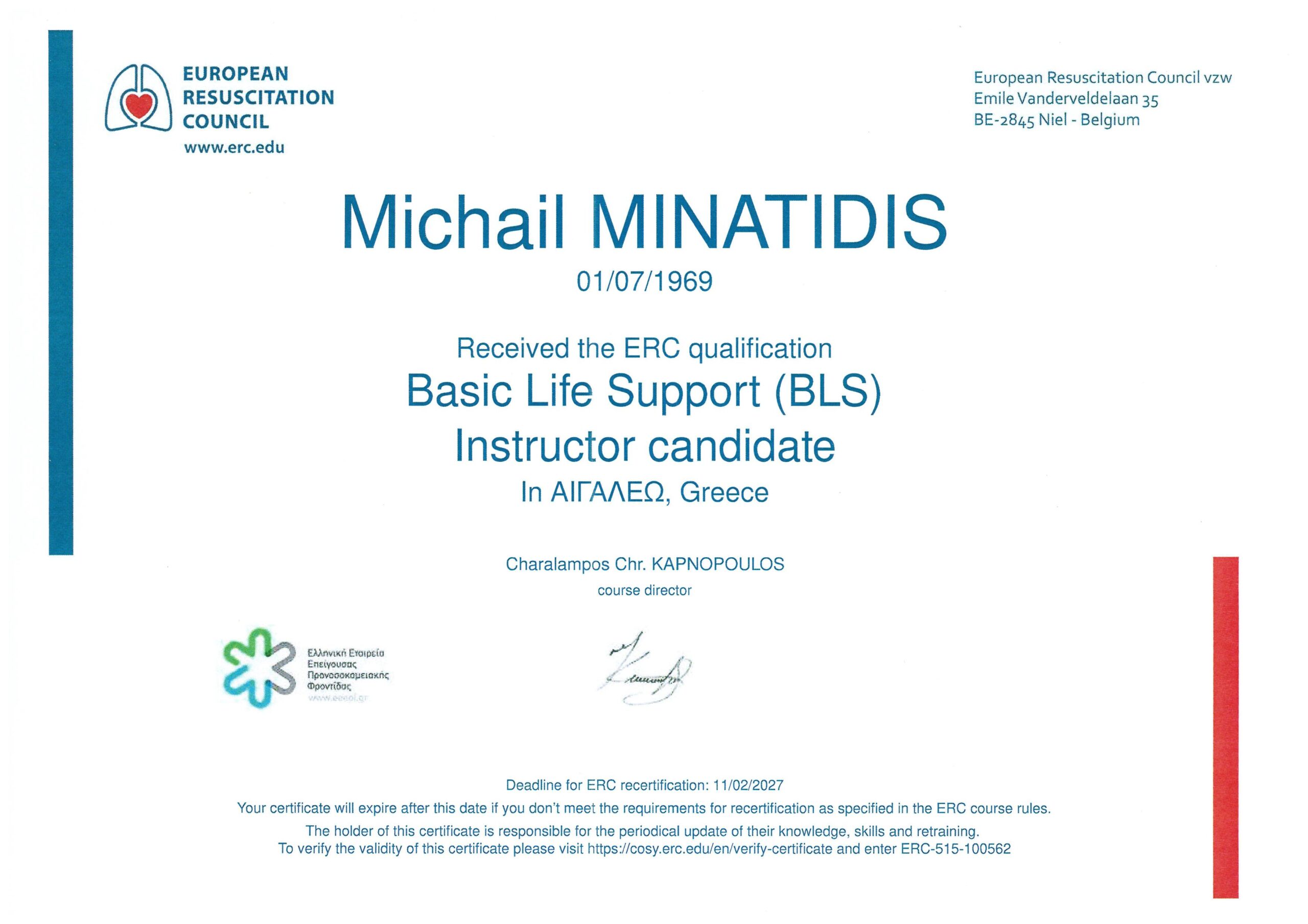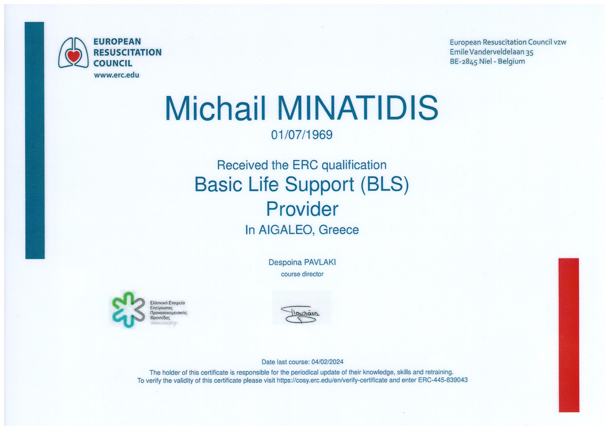 • Ιn 2022 I received the Basic Life Support certification under the auspices of the ERC (European Resuscitation Council) training in cardiorespiratory resuscitation providing CPR as well as the use of a defibrillator to restart the heart.